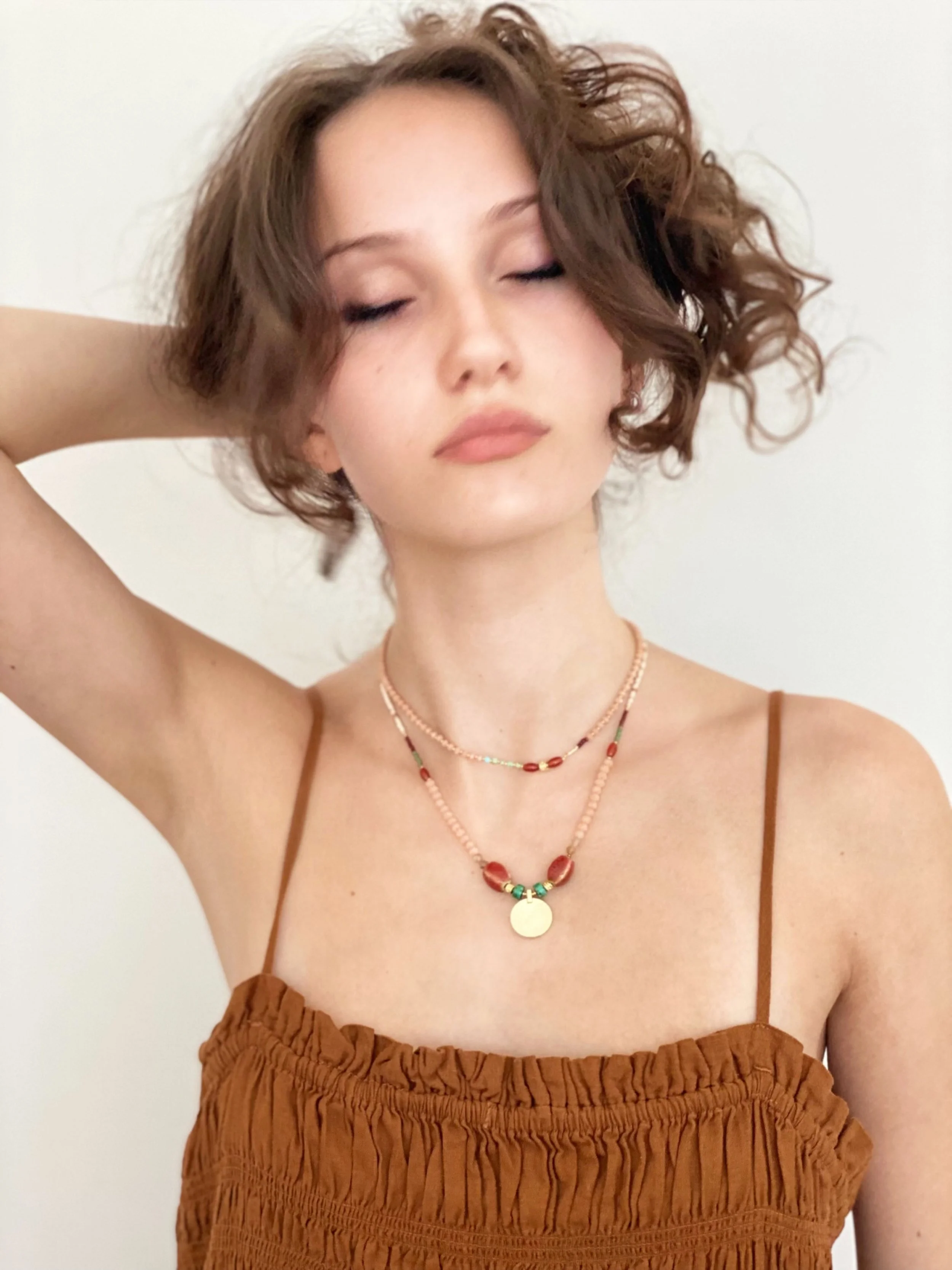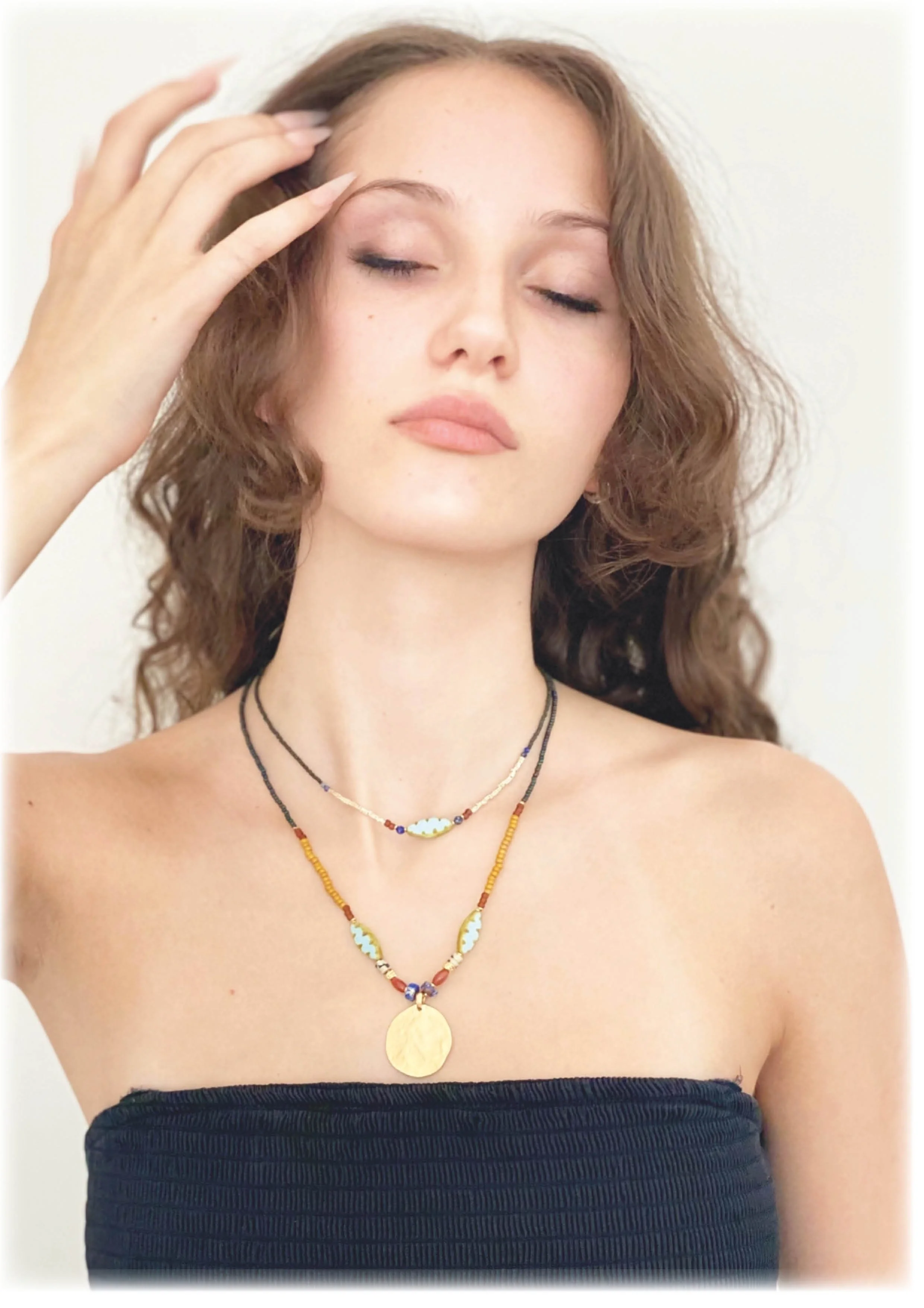 These necklaces are strung with very strong thread which gives them their fluidity, they will live their lives like you do. If you choose to wear it all the time they will burn brightly but won’t last for ever. Semi precious stones also may vary in colour and shape thats their nature and what makes them beautiful they aren’t manufactured.