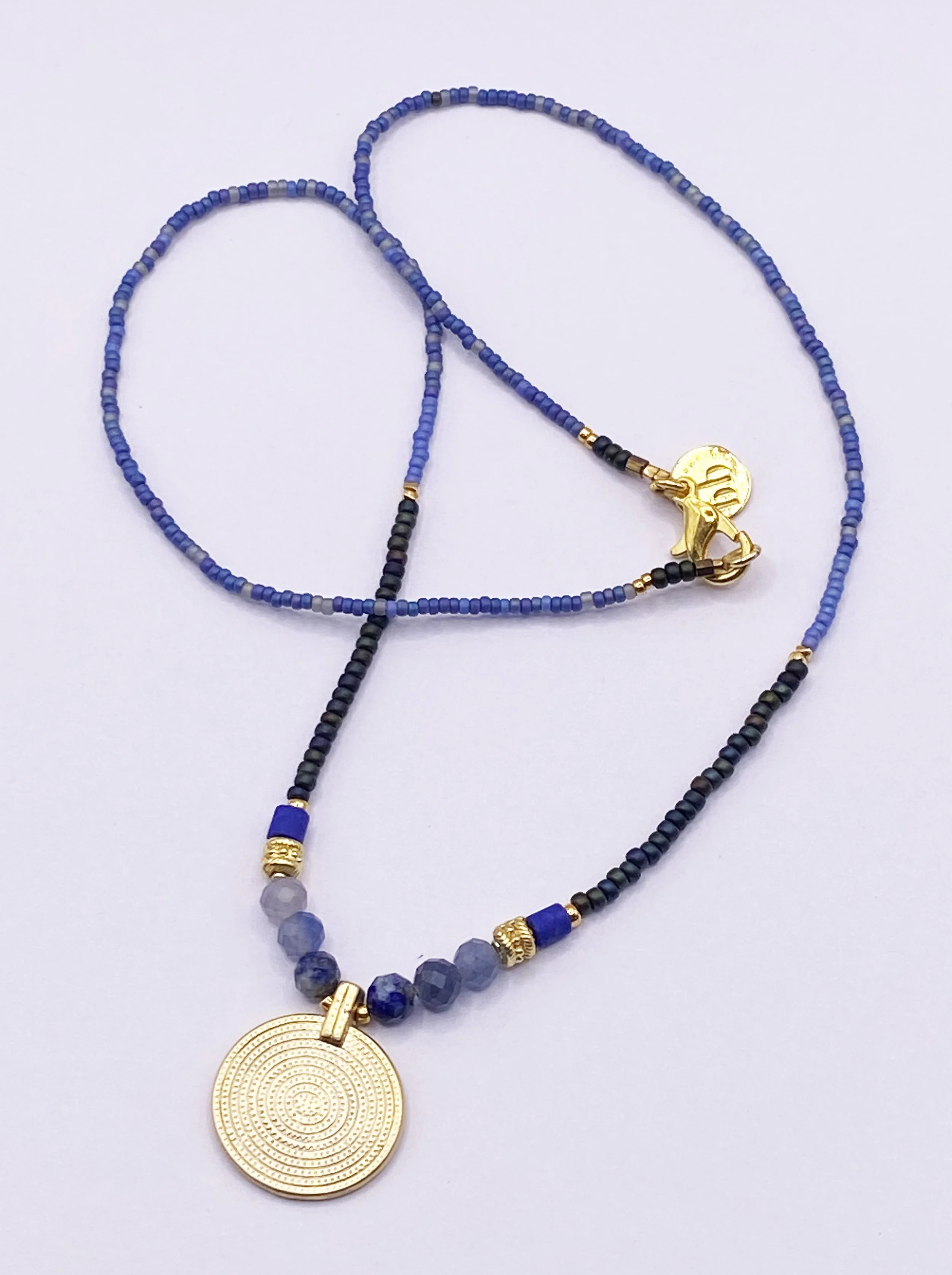 blue agate flank a hammered gold plated coin mixed with lapis lazuli, afghan heishi beads and miyuki seed beads- 43cm total length