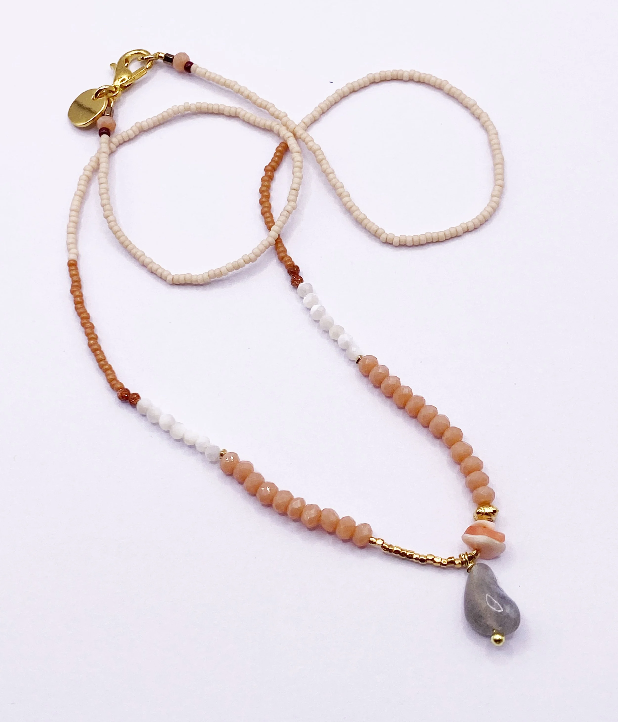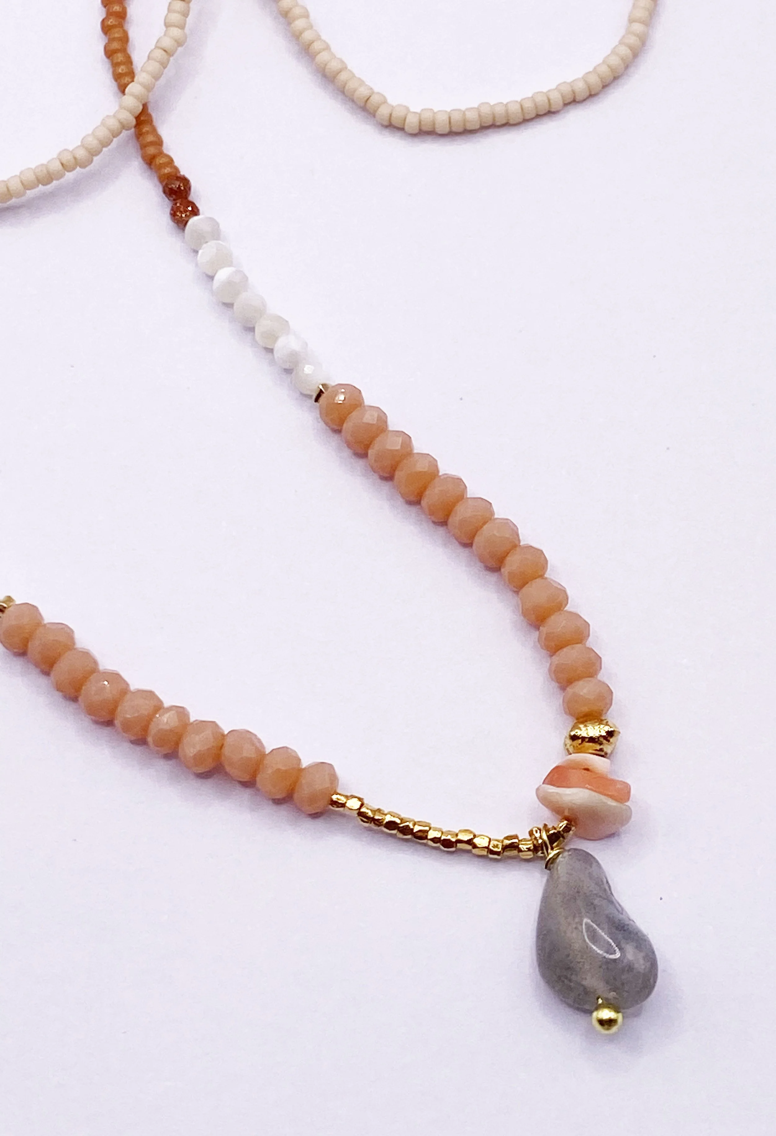 a delicate neutral necklace with a labradorite drop, coral chips, 24kt gold vermeil hill tribe beads, mother of pearl and crystal beads topped off with a gold plated ornate gold bead and miyuki seed beads total length 46cm.