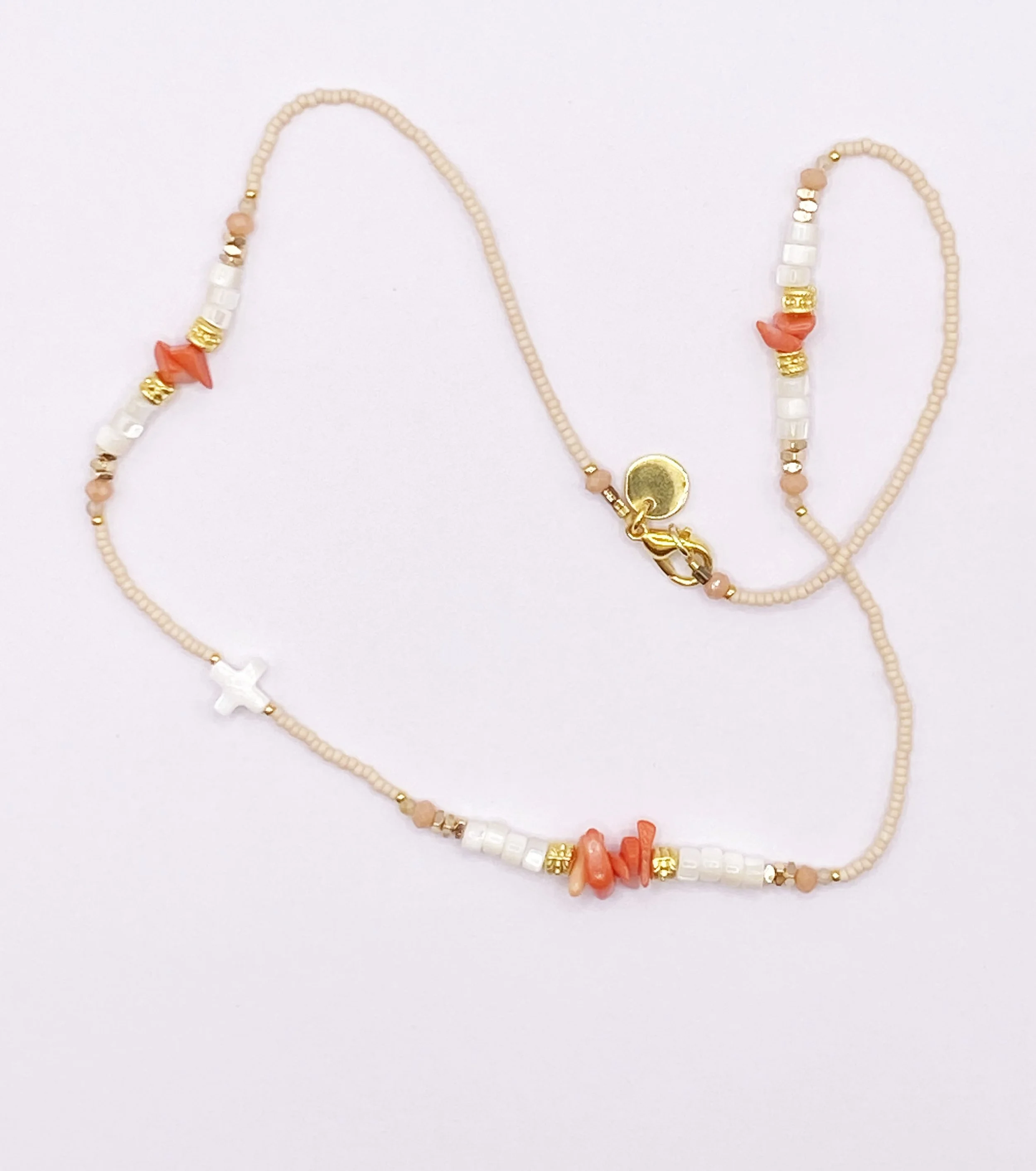 a delicate neutral necklace with mother of pearl wide heishi beads, coral chips, gold plated ornate spacer beads and miyuki seed beads - 42cm total length