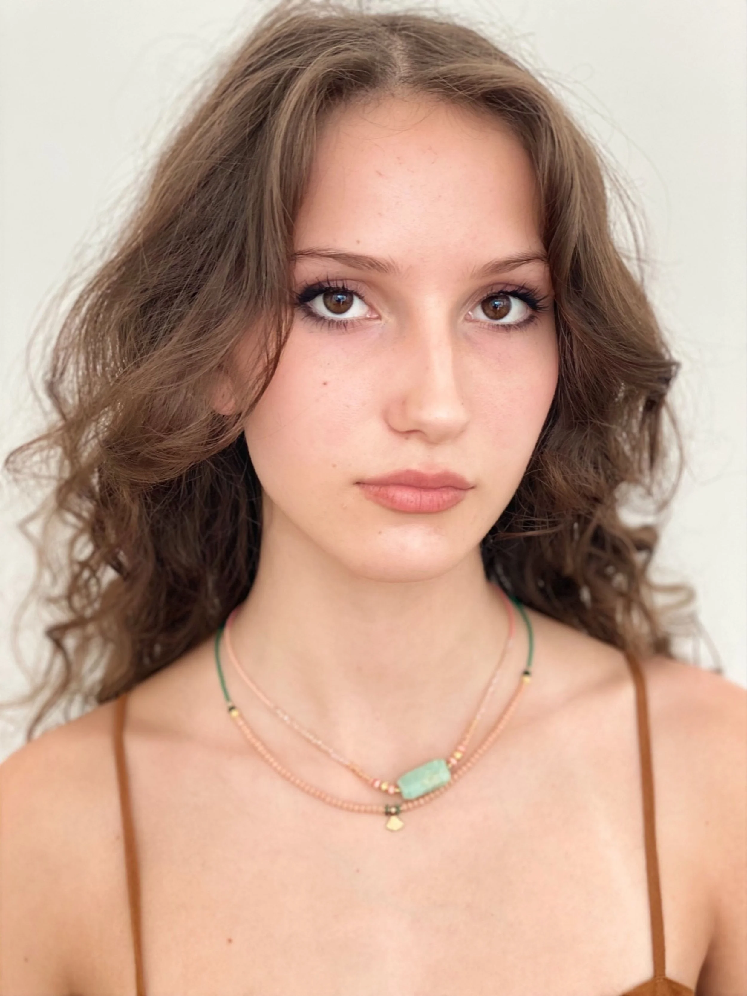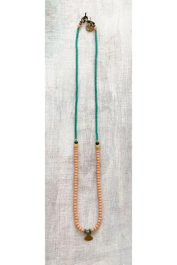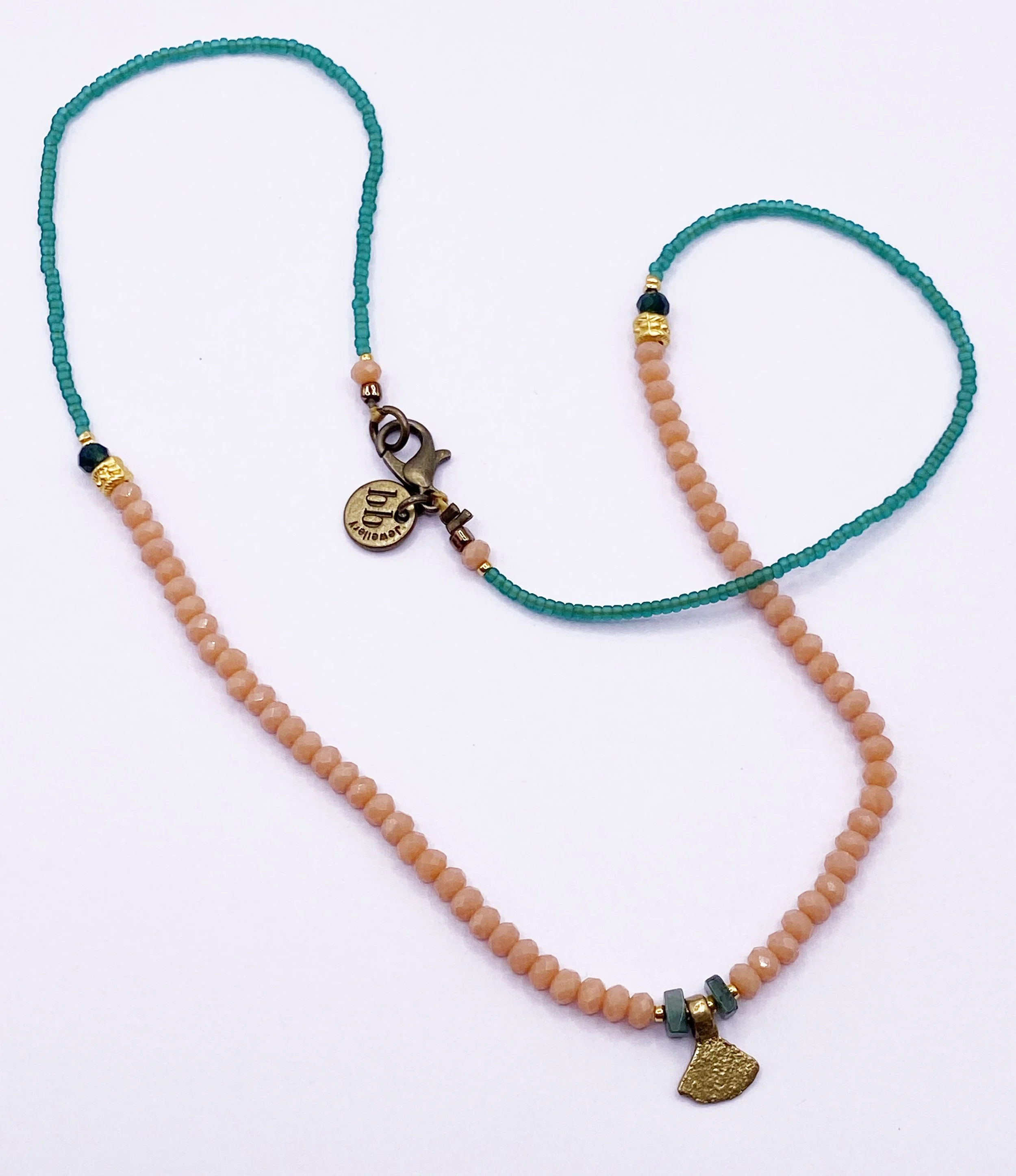 a delicate necklace made up from a tiny brass triangle drop mixed with green aventurine heishi beads, buff coloured crystal beads, gold plated ornate beads and miyuki seed beads 43 cm total length