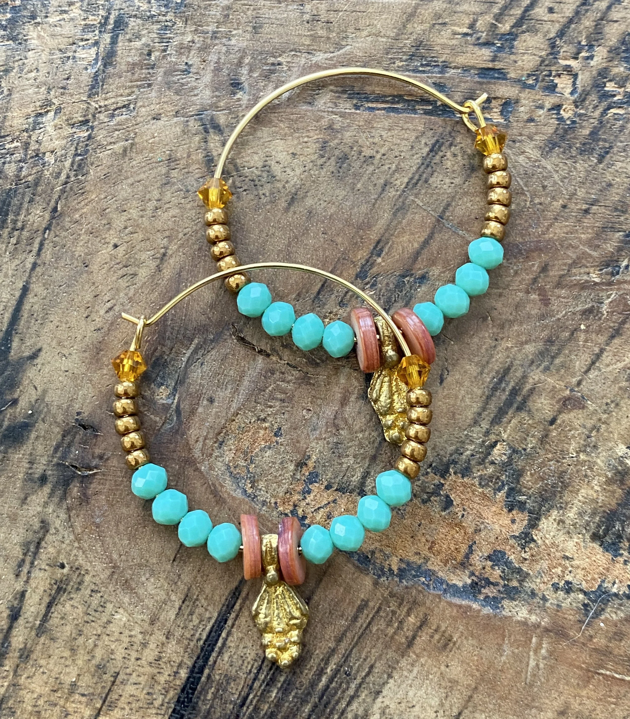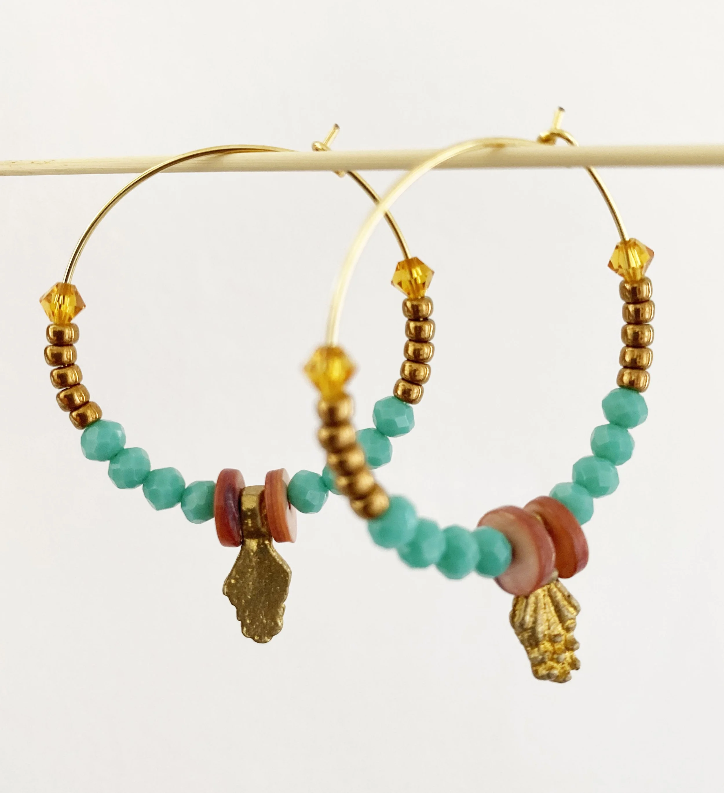 Image 1 of 2 Image 2 of 2 shafta £30.00 gold plated 35mm hoop earring with hammered brass ornate drops, crystal beads bicone glass beads and brown heishi beads Add To Cart Added! gold plated 35mm hoop earring with hammered brass ornate drops, crystal beads bicone glass beads and brown heishi beads