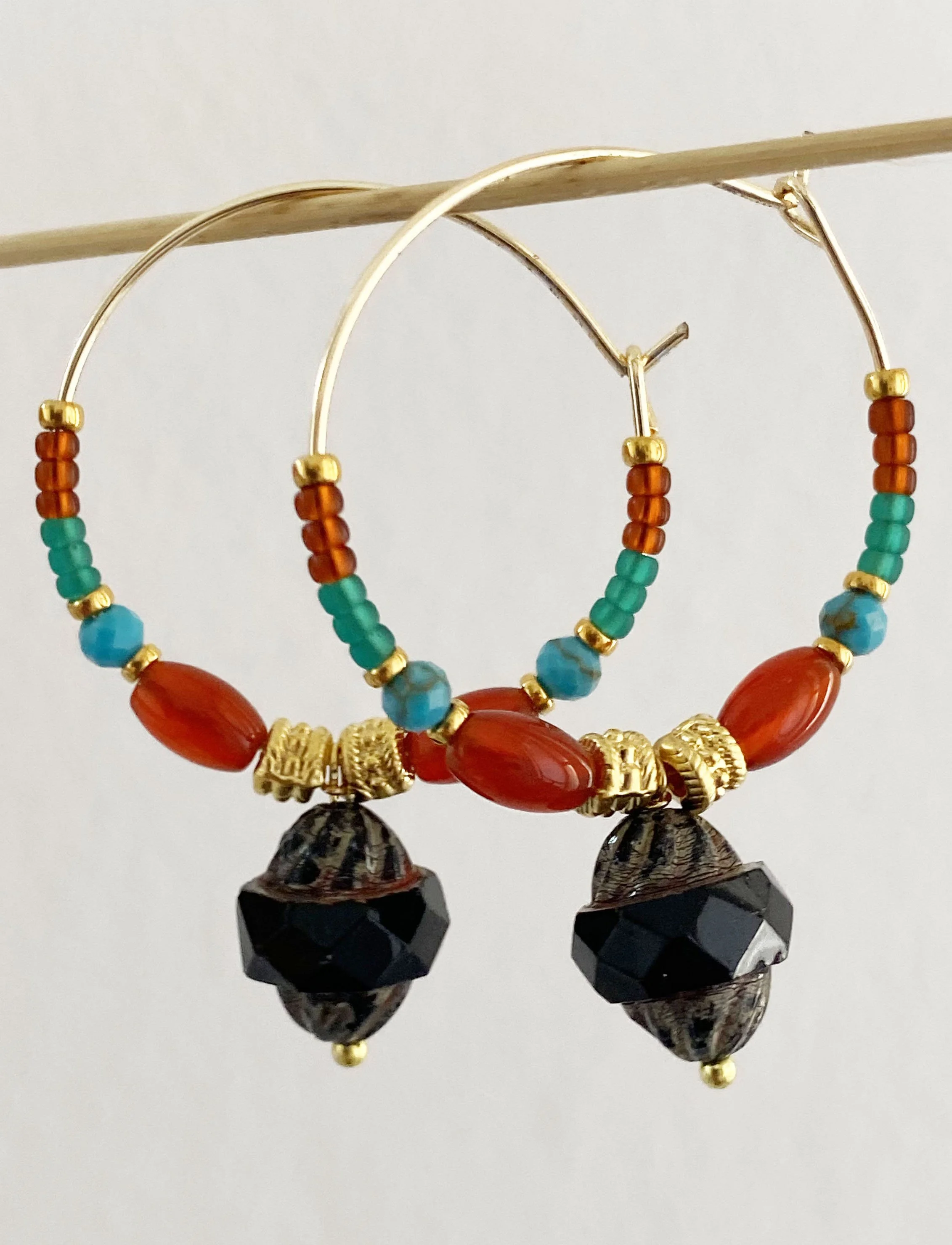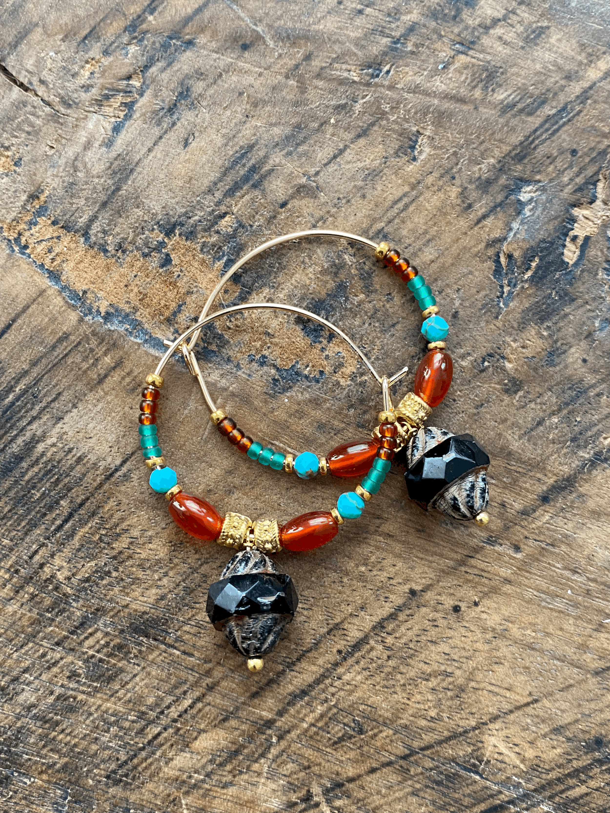 Image 1 of 2 Image 2 of 2 dark night £30.00 one-off gold plated 30mm hoop earring with vintage jet picasso bead with carnelian ovals, pressed turquoise and seed beads Add To Cart Added! one-off gold plated 30mm hoop earring with vintage jet picasso bead with carnelian ovals, pressed turquoise and seed beads